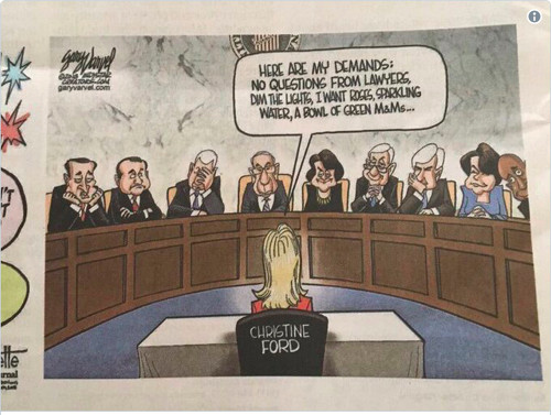Translation: Ms. Ford (or any woman claiming sexual assault), is to be treated as a Sacred Cow and may not be the object of scrutiny, not even in a political cartoon.